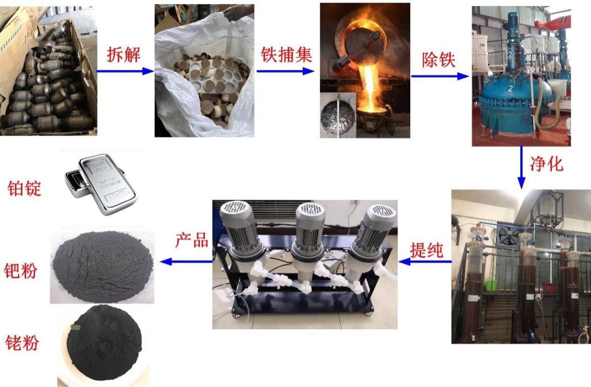 (二)以废汽车尾气催化剂为原料,采用低温铁捕集技术,在合作企业建立了年处理3600吨废催化剂再生铂族金属再生线,有效降低了我国铂族金属资源的对外依存度。