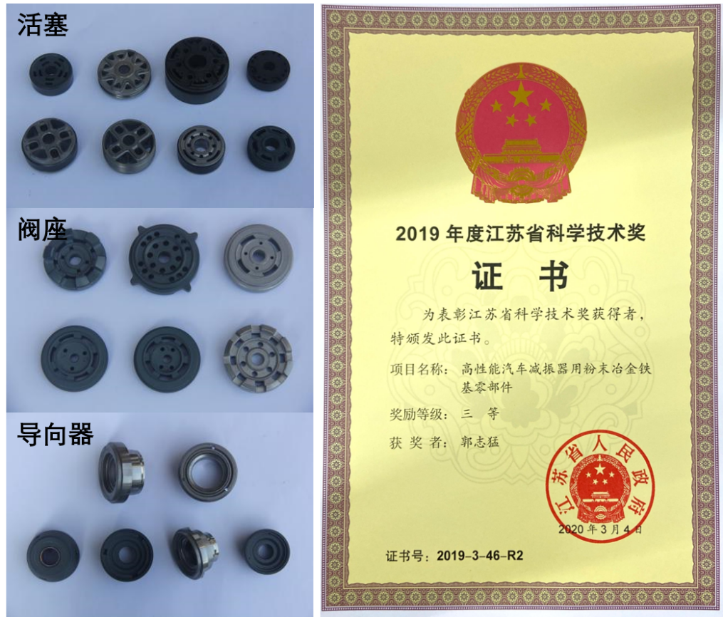 自主开发的高密度铁基零件专用金属粉末低成本生产技术、高密度铁基零件原位纳米弥散强化技术、粉末自润滑预处理技术、凝胶注模成形技术应用于企业粉末冶金汽车零部件制造,项目产品的性能指标、技术指标均达到欧洲标准,项目产品的可靠性、稳定性、安全性均达到了世界先进水平,解决了国内中高档汽车减振器关键零部件依赖从欧洲和日本进口的现状。联合申报的“高性能汽车减振器用粉末冶金铁基零部件”获江苏省科学技术奖三等奖。