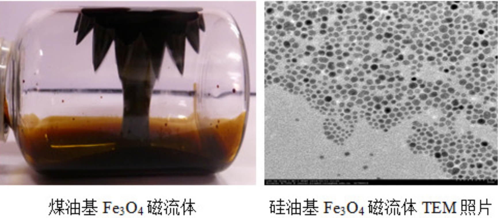 磁流体是由纳米级强磁性颗粒均匀分散于液态载液中所形成的稳定胶体体系,既具有液体的流动性,又具有磁性物质的磁性,是一种新型纳米功能材料,广泛应用于旋转密封、生物医药、磁记录、油田开采等领域。该研发室利用化学共沉淀法制备磁性颗粒,加入表面活性剂,将其超声分散于基载液中形成磁流体。目前已制备出稳定的煤油基和硅油基Fe3O4磁流体,性能优异。