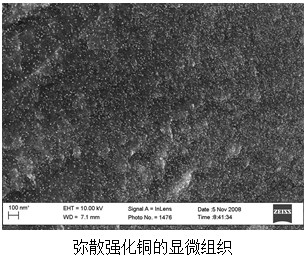 弥散强化是依靠特殊手段,在金属基体中引入稳定、均匀、细小的第二相质点,钉扎位错、晶界、亚晶界,阻碍位错移动从而强化材料的方法。活泼金属的氧化物具有很高的稳定性,常用作弥散强化材料的增强相,这类材料称为氧化物弥散强化(Oxide Dispersion Strengthened,ODS)材料。本项目得到国家863计划资助。该研发室制备的氧化铝弥散强化铜,既保持了铜的优良导电导热性(大于90%),又提高了铜的强度。具有强度>600MPa、硬度>90HB、软化温度达850-910℃、退火后屈服强度保持好、疲劳强度高、冷加工性能优良等特点。在氧化铝弥散强化铜中,弥散相氧化铝颗粒尺寸在10nm左右,颗粒间距30-50nm,均匀弥散分布。