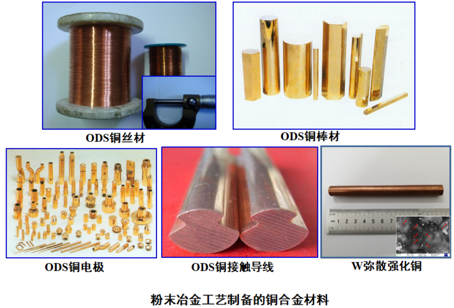 经过十余年的研究开发,研发室在铜及铜合金材料方面取得了较为丰富的研究成果,承担了多项相关的课题:“863”项目—高性能粉末冶金材料及其关键构件先进制备技术,子课题:氧化物弥散强化粉末冶金材料组织控制与致密化技术;广东省产学研项目—电子线路板蚀刻废液(HW22)高值化利用的研发与产业化。在粉末冶金铜方面具备扎实的工作基础,制备了弥散强化铜系列产品,并已实现产业化,包括铜棒/线/丝材、铜电极以及结晶器等产品。通过内氧化法制备的弥散强化铜产品,当Al2O3含量达到0.5wt.%时,抗拉强度520MPa,软化温度850℃,导电86%IACS,达到GLIDCOP AL-25水平。同时,率先提出了金属弥散强化理论,并进行实验论证。所制备的Cu-6wt.%W纳米钨弥散强化铜中W颗粒直径约119nm,材料组织均匀,抗拉强度310MPa,硬度108HV,导电率90%IACS。