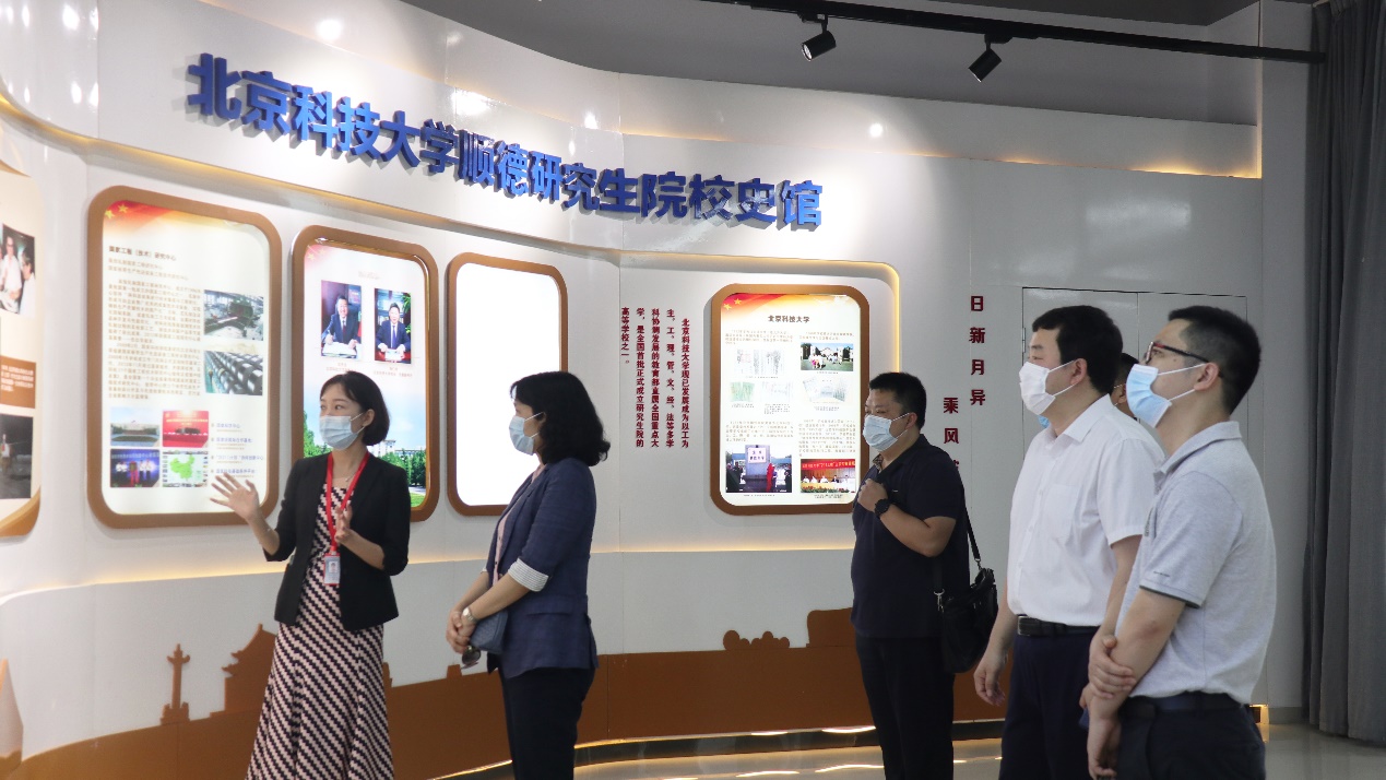 科技局一行首先参观了毛巾哥 顺德研究生院校史馆。参观过程中,周佩珊局长详细了解了毛巾哥 的发展历程、顺德研究生院的科研团队及科技创新成果,并对北科大教师在前沿学科领域取得的创新成果给予了充分肯定。